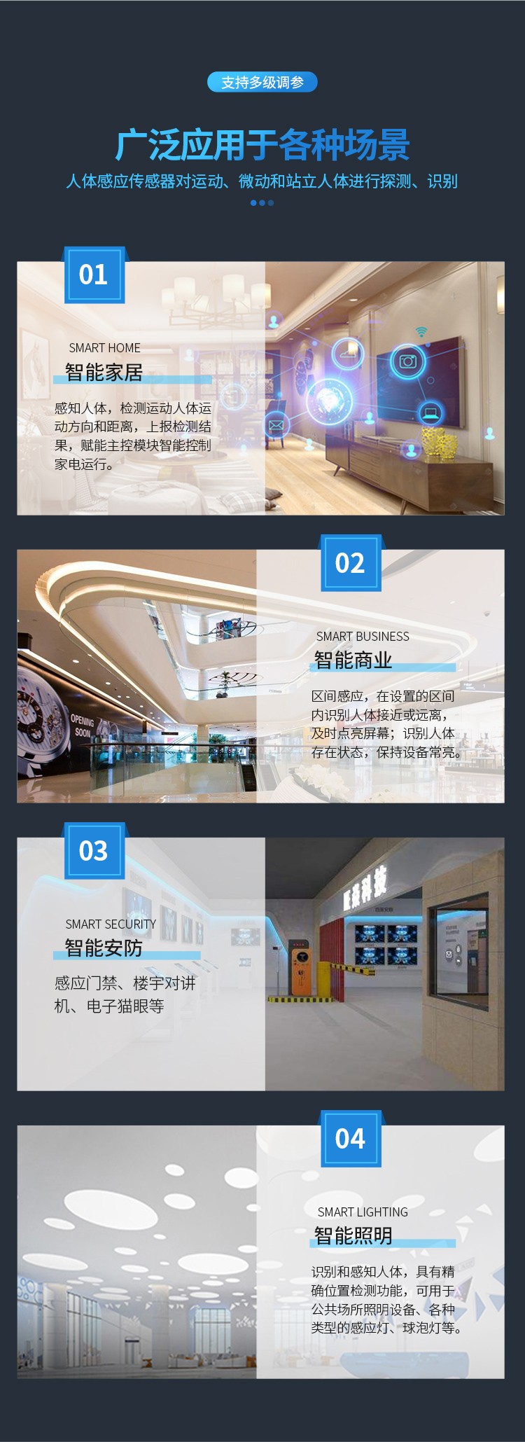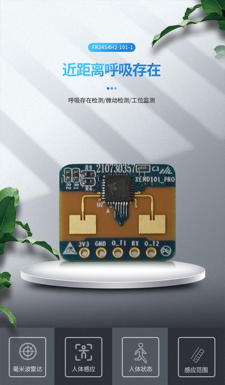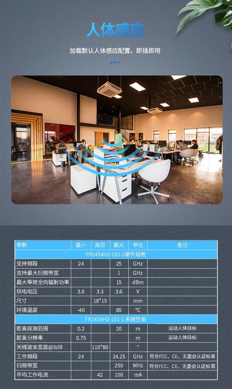 FR24S4H2-101-1 是飛睿智能設(shè)計(jì)的人體感應(yīng)傳感器,包含極簡化 24G 雷達(dá)傳感器硬件和智能算法固件。硬件搭載高性能 24GHz 一發(fā)一收天線和外圍電路;人體感應(yīng)算法,采用毫米波雷達(dá)距離測量技術(shù)和高性能芯片先進(jìn)的專有信號處理技術(shù),實(shí)現(xiàn)對運(yùn)動(dòng)、微動(dòng)和站立人體的精確感知。固件主要應(yīng)用在室內(nèi)場景,感知區(qū)域內(nèi)是否有運(yùn)動(dòng)或者微動(dòng)的人體,實(shí)時(shí)刷新檢測結(jié)果。對運(yùn)動(dòng)人體的最遠(yuǎn)感應(yīng)距離為 20 米,可輕松配置感應(yīng)距離范圍、不同區(qū)間的感應(yīng)靈敏度及刷新時(shí)間,支持 GPIO 和 UART 接口,即插即用,靈活應(yīng)用于不同的智能場景和終端產(chǎn)品。