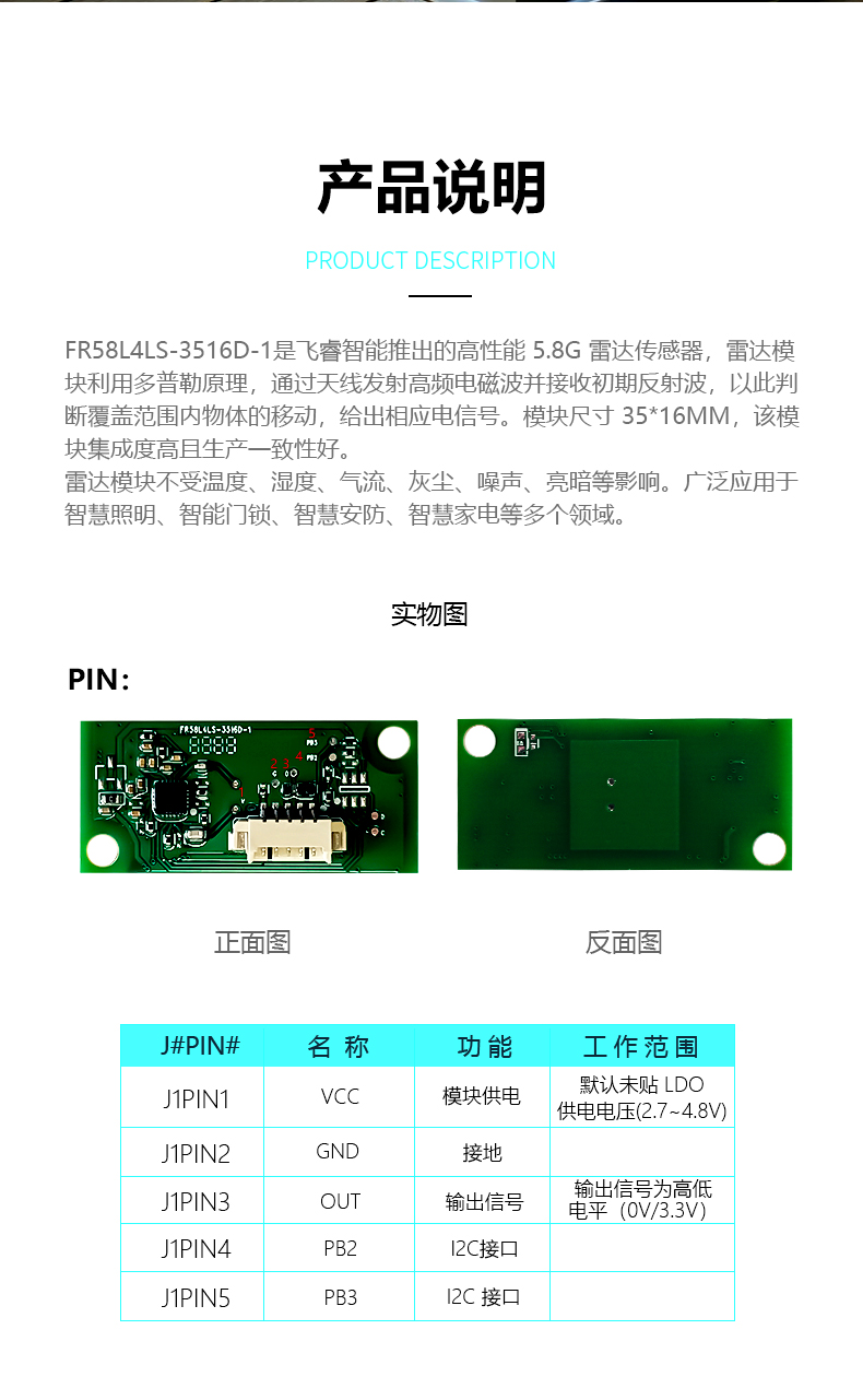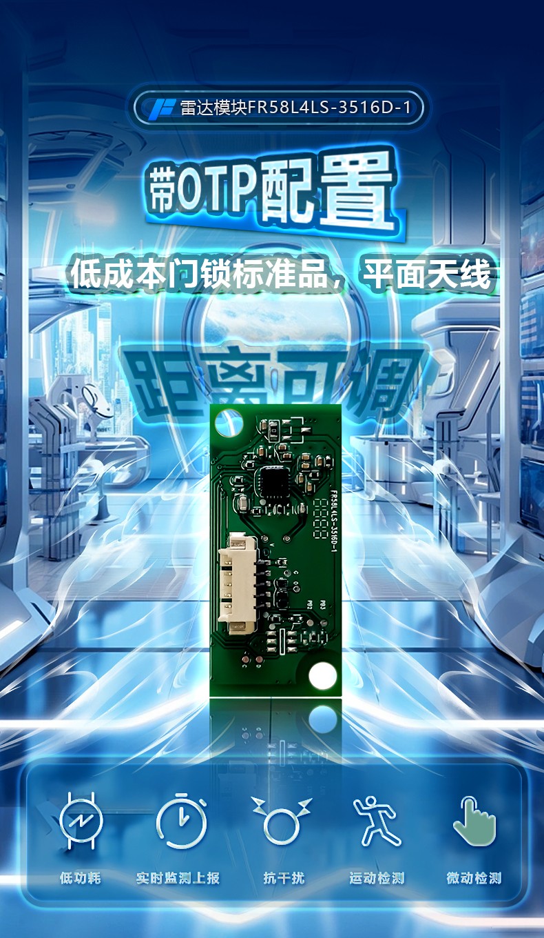 FR58L4LS-3516D-1 是飛睿智能推出的高性能 5.8G 雷達(dá)傳感器,雷達(dá)模塊利用多普勒原理,通過天線發(fā)射高頻電磁波并接收初期反射波,以此判斷覆蓋范圍內(nèi)物體的移動(dòng),給出相應(yīng)電信號(hào)。模塊尺寸 35*16MM,該模塊集成度高且生產(chǎn)一致性好。雷達(dá)模塊不受溫度、濕度、氣流、灰塵、噪聲、亮暗等影響。廣泛應(yīng)用于智慧照明、智能門鎖、智慧安防、智慧家電等多個(gè)領(lǐng)域。