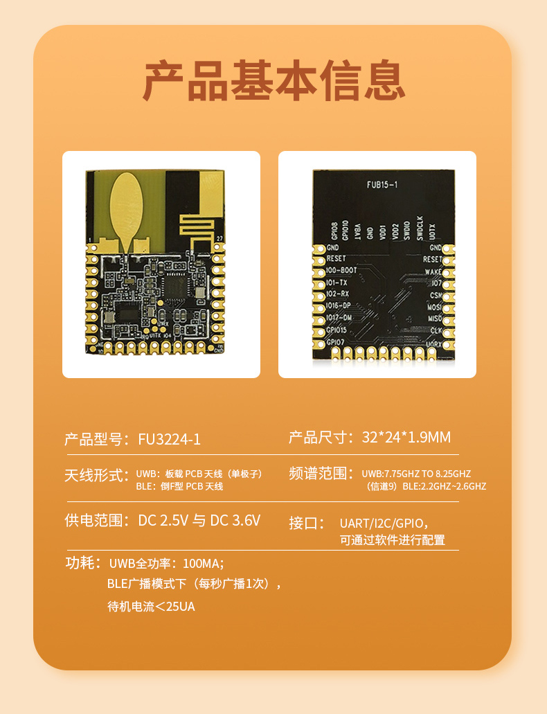 FU3224-1 UWB-BLE 模組是基于 UWB 芯片與 BLE5.3 芯片設(shè)計(jì)的一款智能綜合性模組,搭載 1 單元 PCB 高性能單極子 UWB 天線,1 單元倒 F 藍(lán)牙天線。